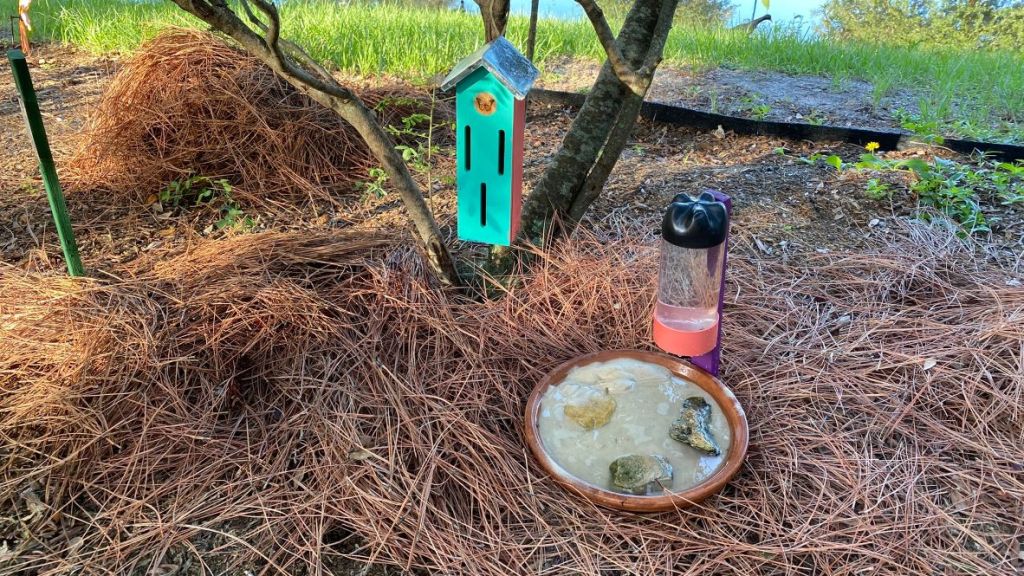 A picnic table has been added to the garden. Come and enjoy lunch in the shade at the garden. The pine straw has been spread and a new butterfly tiny house is all setup for new residences.